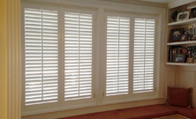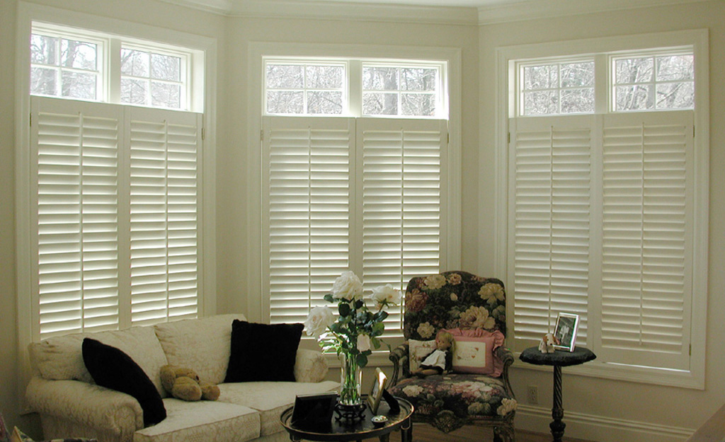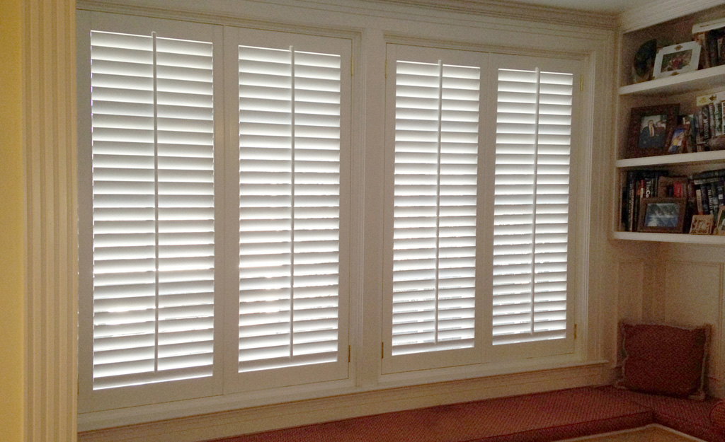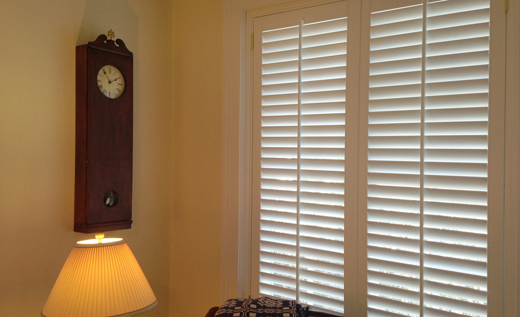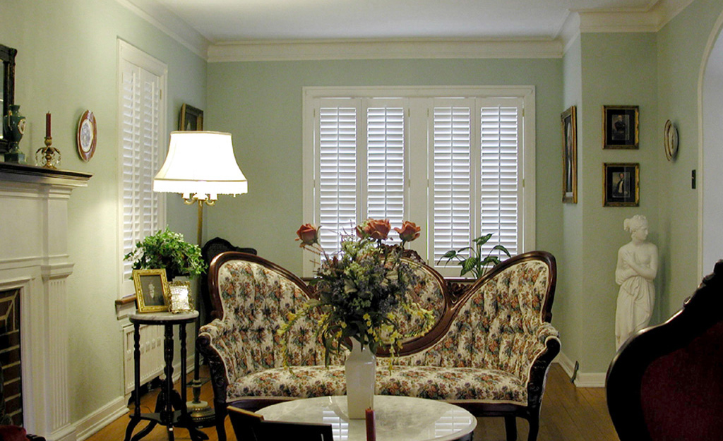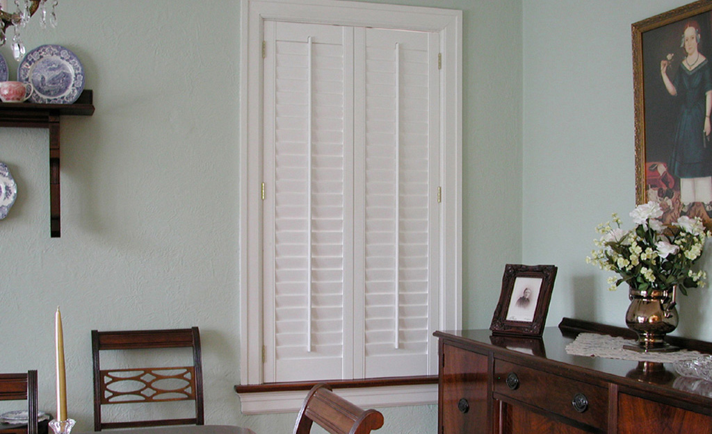When we inside mount 2-1/4" louvers into a wood cased opening with thin panels, the finished product is a super dressy look. Not using divider rails lets the panel appear as tall and thin as can be, only accentuating its dressiness. The resulting scale fits a traditional setting or a decor with small patterns and detailed features in furniture and mouldings.